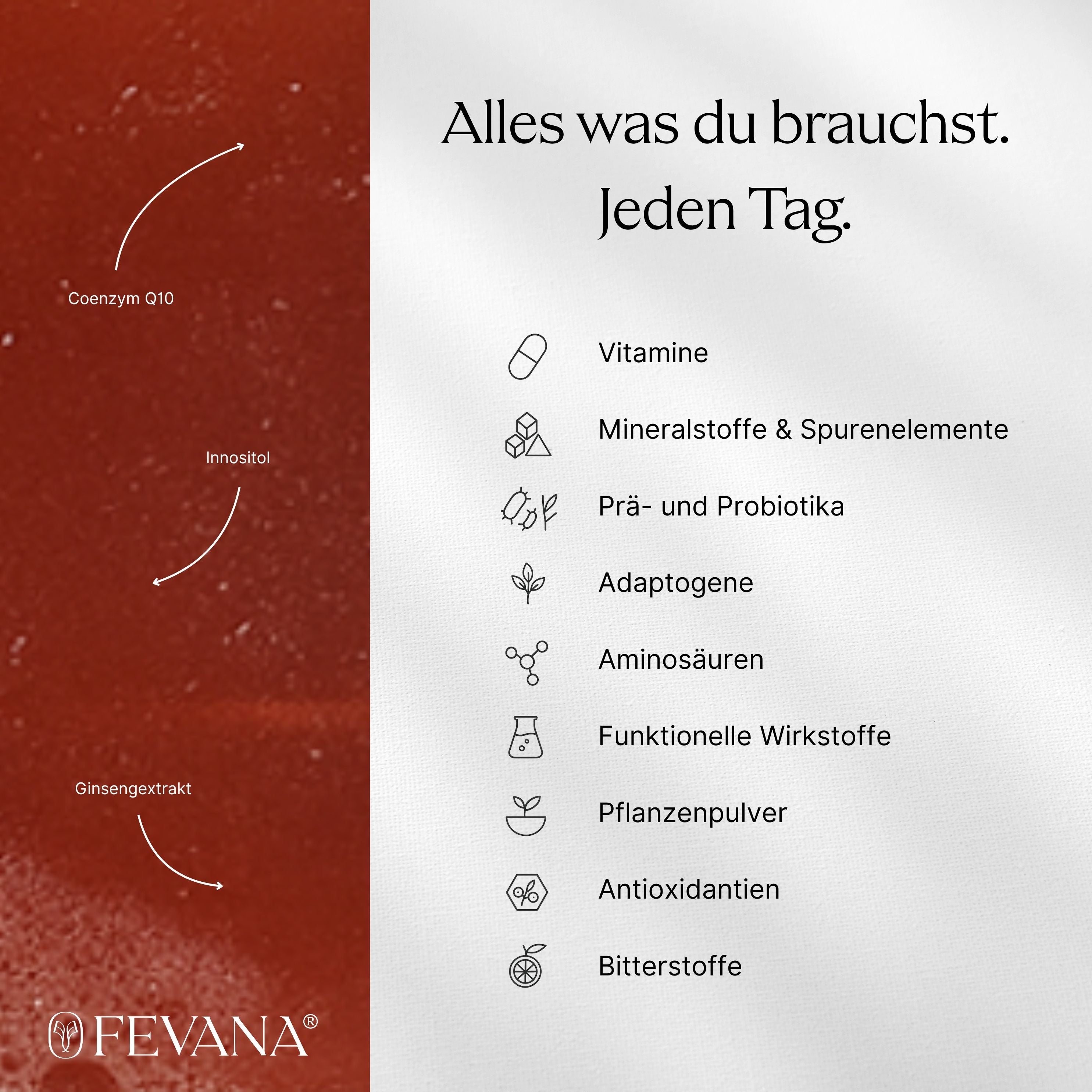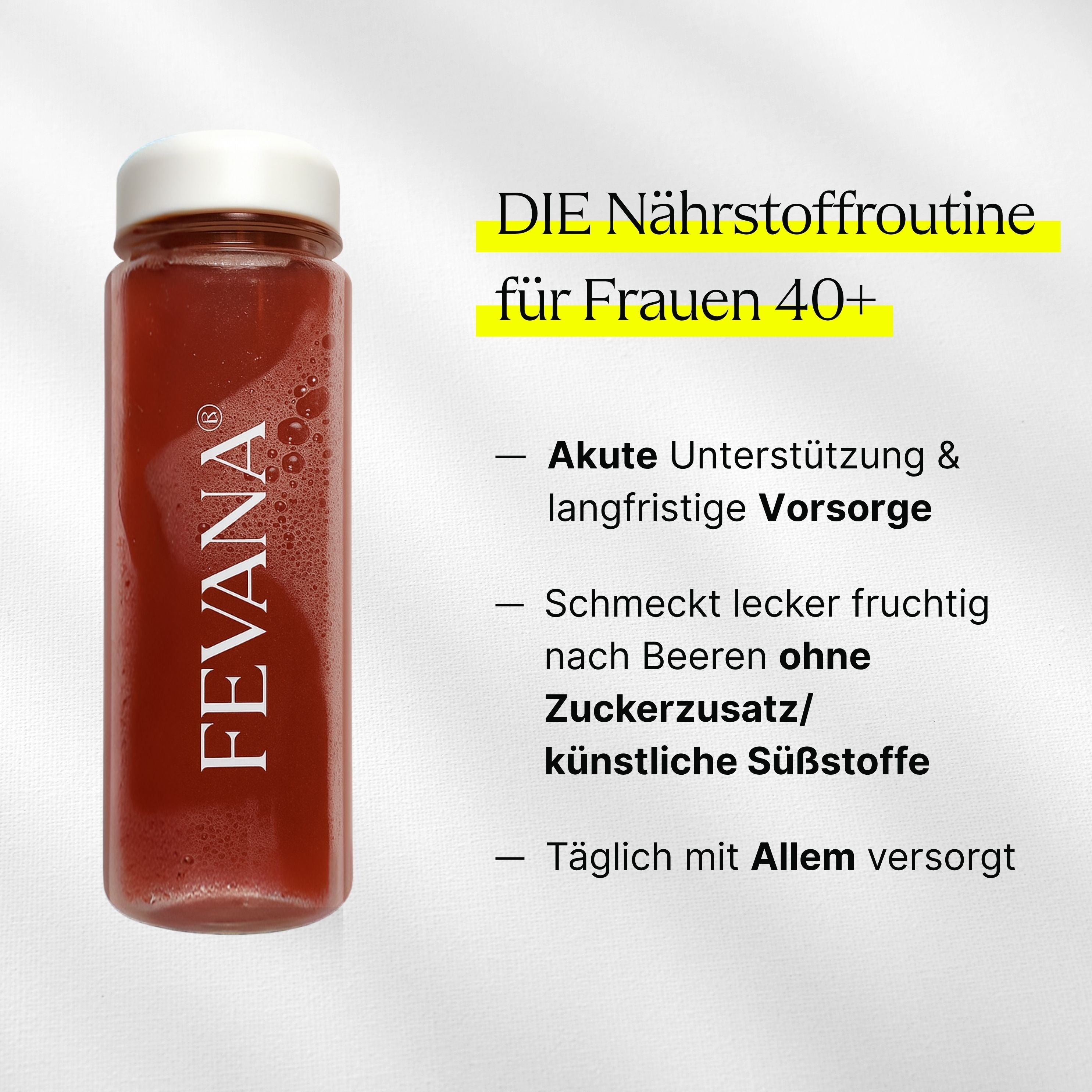 FEVANA ist kein reines All-in-One-Versprechen, sondern ein auf den weiblichen Körper abgestimmtes Supplement-System. Natürlich, vegan, zuckerfrei – in Pulverform für optimale Aufnahme. Statt Überdosierung oder Einheitsformel setzt FEVANA auf natürliche Unterstützung mit optimal kombinierten Inhaltsstoffen für Frauen 40+.