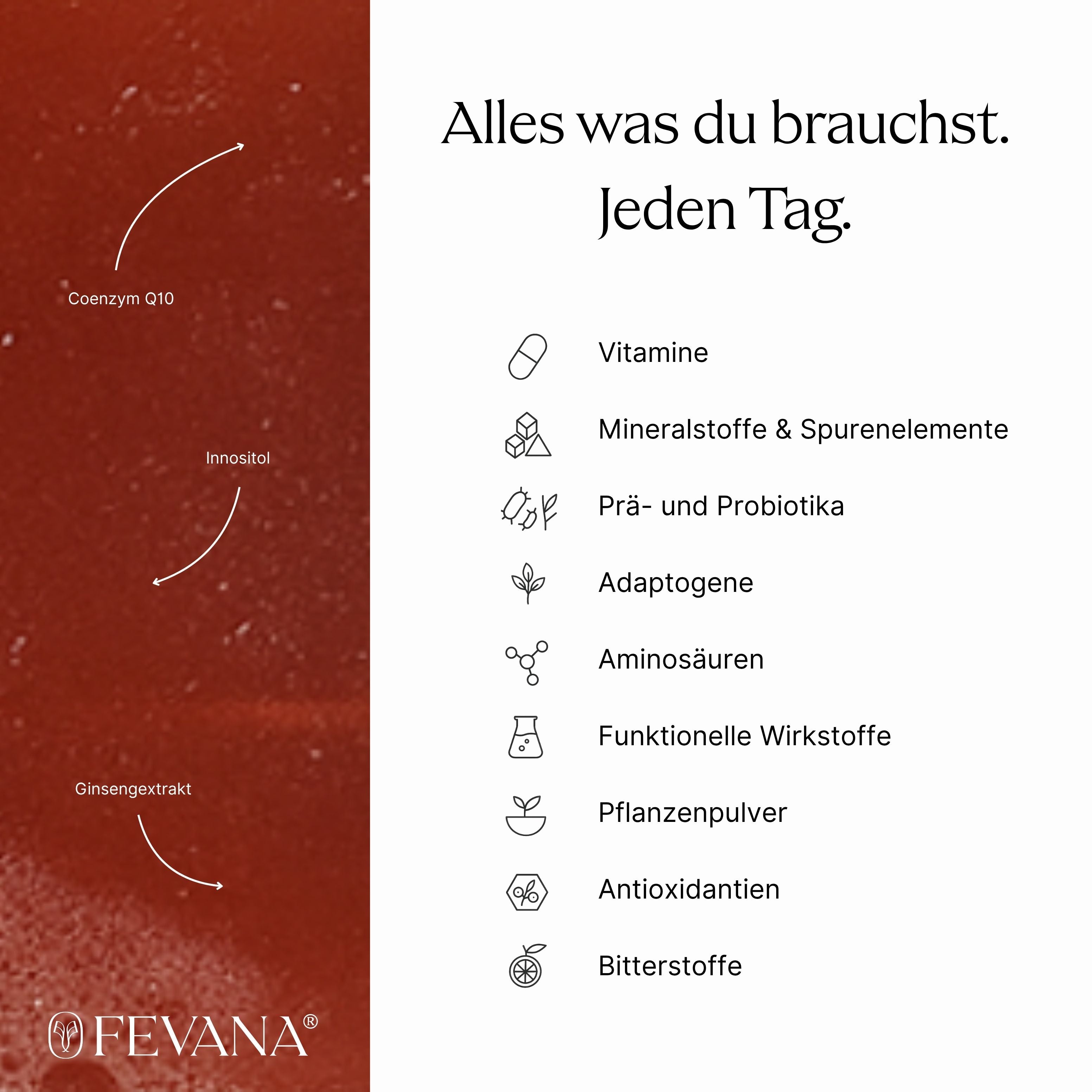 Die Inhaltsstoffe in FEVANA werden sorgfältig ausgewählt und aufeinander abgestimmt, sodass der Körper sie gut aufnehmen kann und sie zusammen noch effektiver wirken können.
