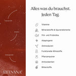 FEVANA ist eine wissenschaftlich fundierte Kombination aus Vitaminen, Mineralstoffen, Bakterienkulturen, traditionellen Pilzen, Ballaststoffen, Enzymen und natürlichen Pflanzenstoffen – all das steckt in nur einem täglichen Messlöffel.