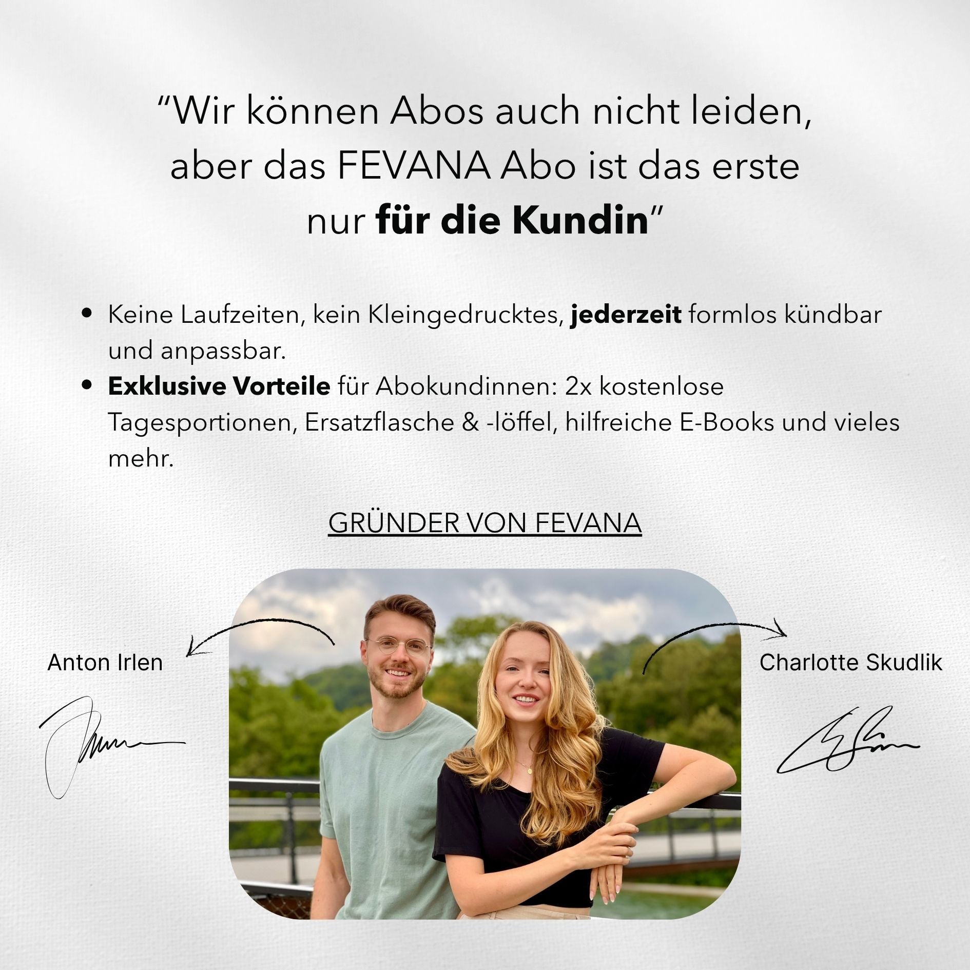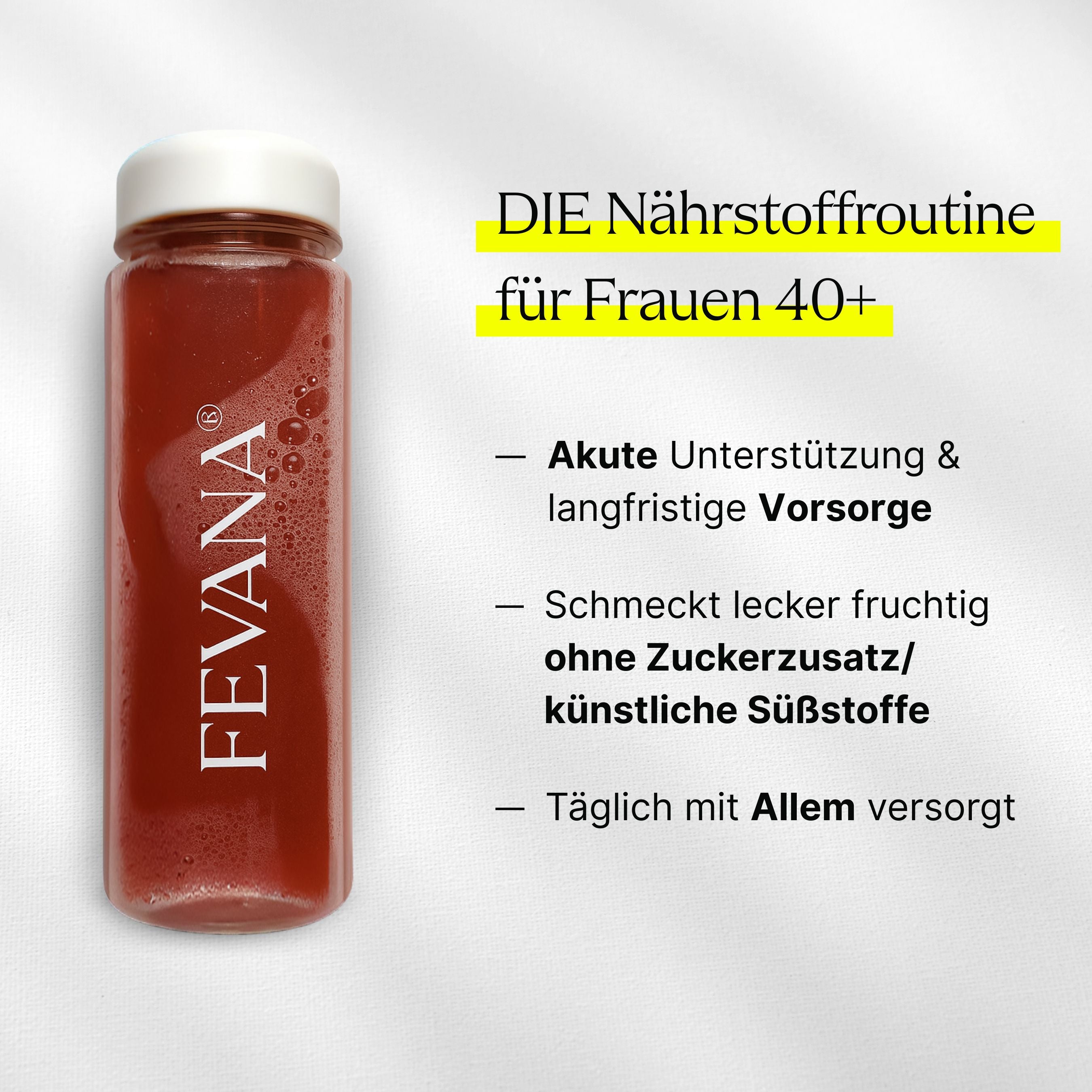 FEVANA kannst du in Wasser oder Smoothies einrühren. Der Geschmack ist dezent fruchtig, ganz ohne Zuckerzusatz oder künstliche Aromen. Viele Kundinnen sagen: „Endlich ein Supplement, das ich gerne trinke!"