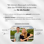 Unser Abo ist für dich da – damit deine tägliche Selfcare so einfach wie möglich wird. Du erhältst dein FEVANA Paket regelmäßig, ganz ohne Mindestlaufzeit, Kleingedrucktes oder Verpflichtungen. Pausieren oder kündigen? Jederzeit formlos möglich. Auch das Lieferintervall kannst du flexibel anpassen – ganz unkompliziert per WhatsApp, E-Mail oder Instagram.